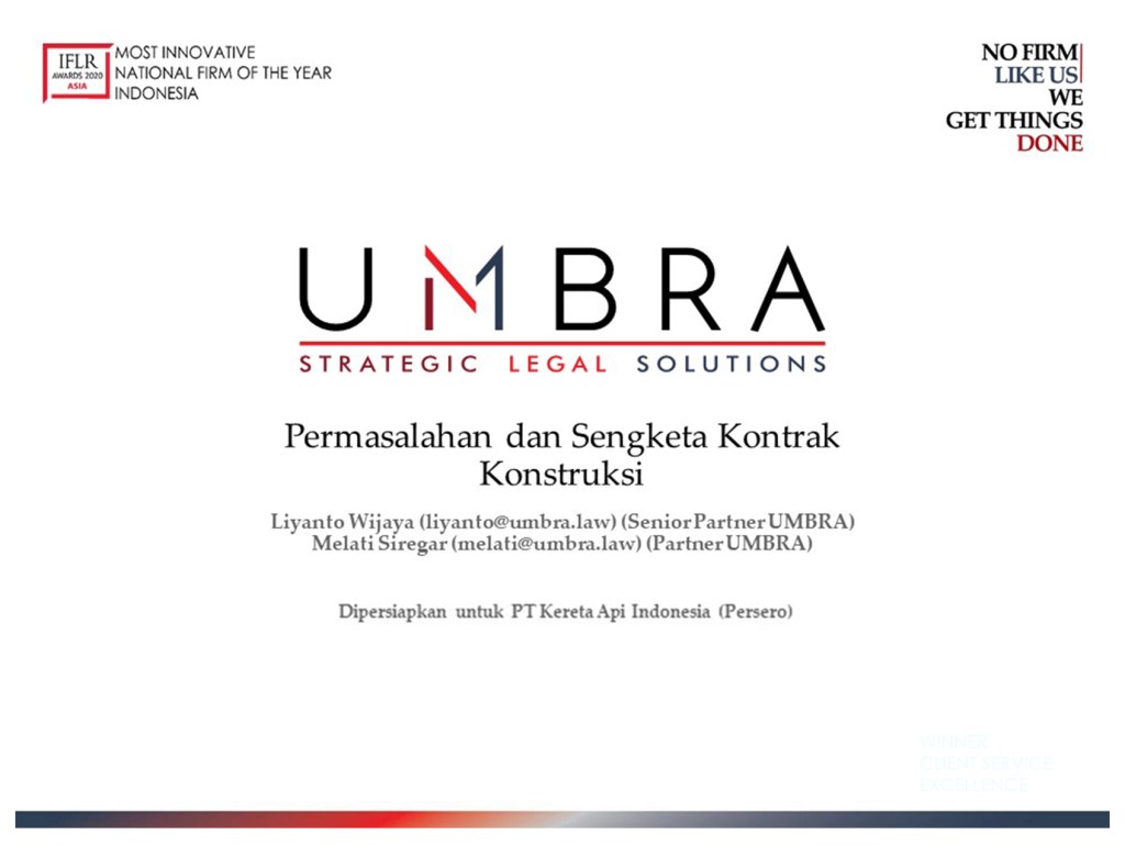 Construction projects are often associated with intricacy and multidisciplinary. Hence, the existence of conflicts is unavoidable, and having deep understanding on the conflicts, how to prevent and resolve them is paramount for the projects’ sustainability. As part of our commitment to provide in-depth training for our clients, we held a webinar on “Permasalahan dan Sengketa Kontrak Konstruksi“ for PT Kereta Api Indonesia (Persero) on 13 November 2020. The webinar was participated by our Senior Partner, Liyanto Wijaya, who delivered a comprehensive understanding on construction contract under the latest legal framework, complemented by a thorough explanation on construction dispute resolution mechanism provided by our Partner, Melati Siregar.