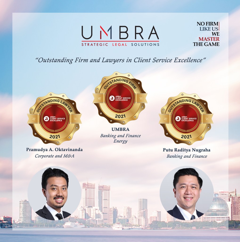 We are incredibly delighted to announce that UMBRA has been recognized as Best Overall Firm in Client Service Excellence for the second time in a row since Asialaw inauguration award in 2020! Pramudya A. Oktavinanda and Putu Raditya Nugraha are also recognized as Indonesia’s Outstanding Lawyers in Client Service Excellence, receiving the highest aggregate ratings from detailed clients’ feedback for quality of legal service in the field of Corporate & M&A and Banking & Finance, respectively.