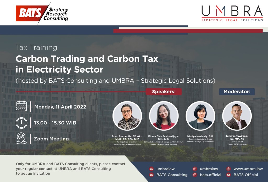 Specifically designed to address UMBRA and BATS Consulting’s clients’ needs and requests, we proudly present a Tax Seminar “Carbon Trading and Carbon Tax in Electricity Sector” on Monday, 11 April 2022 at 13.00-15.30 WIB.