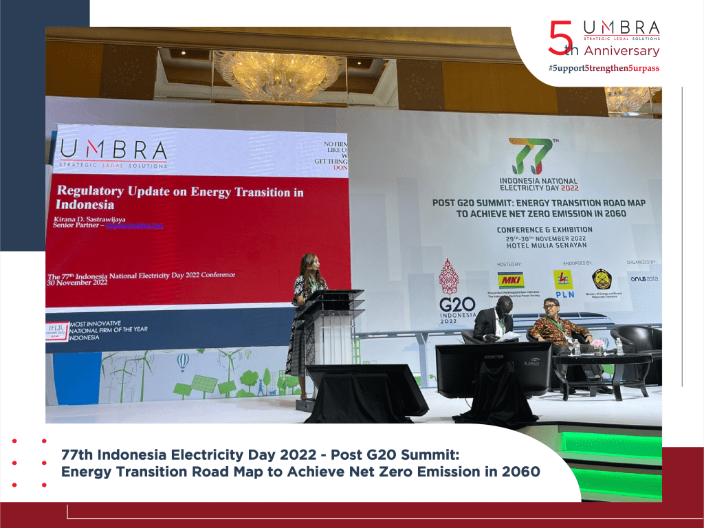 It is been our pleasure to be invited by Masyarakat Ketenagalistrikan Indonesia to celebrate the 77th Indonesia Electricity Day at Hotel Mulia Senayan, 30th of November 2022. The main theme of this event is: “Post G20 Summit: Energy Transition Road Map to Achieve Net Zero Emission in 2060”, where our Head of Projects, Energy and Infrastructures Practice Group, Kirana Sastrawijaya was invited to be a speaker at Panel Discussion of Driving the Energy Transition through Government Regulation. Kirana shared the panel with other distinguished speakers, i.e., Wanhar the Director of Development Program of Directorate General of Electricity of the Ministry of Energy and Mineral Resources, Dr. Aznan Ezraie Ariffin CSO Strategy Management of TN, and Gondia Sokhna Seck, the Programme Officer, Policy Advice, IRENA. Kirana presented a broad overview of Regulations related to the Energy Transition in Indonesia including the key considerations and existing projects related to the energy transition.