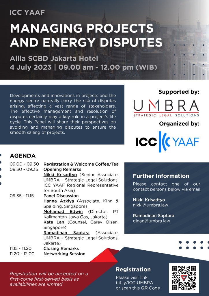 To secure your place at the event, we kindly request that you register by clicking on the following link: https://2go.iccwbo.org/icc-yaaf-managing-projects-and-energy-disputes.html
